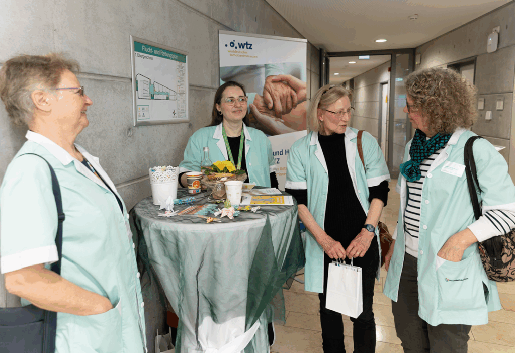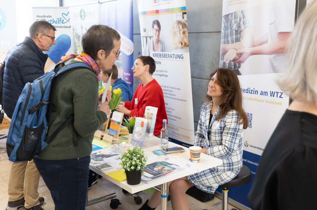 Abschließend fand ein Talk mit Prof. Dr. Dr. Alpaslan Tasdogan, Leiter des Instituts für Tumor-Metabolismus, PD Dr. Miriam Götte, Leiterin der Sport- und Bewegungstherapie an der Universitätsmedizin Essen, und Kristina Hardt, Leiterin des Peer-Mentoring-Projekts OncoPartner im WTZ, statt, der den Fokus auf Selbstwirksamkeit, Aufräumen von Mythen, die Wichtigkeit von Selbsthilfe und Austausch, sowie Sport und Ernährung bei Krebs legte. Teilnehmende hatten die Möglichkeit, Fragen zu stellen und praktische Tipps für den Alltag mitzunehmen.